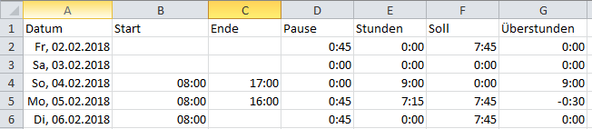 Excel zeigt die Fehlzeit in Zelle G5 korrekt an. Als unschöner Nebeneffekt wurden die Datumseinträge in Spalte A verändert. Beim Rechnen mit negativen Zeiten empfiehlt es sich deshalb, die oben beschriebenen Einstellung vorzunehmen, bevor Sie Einträge (insbesondere Datumswerte) auf den Tabellenblättern vornehmen.